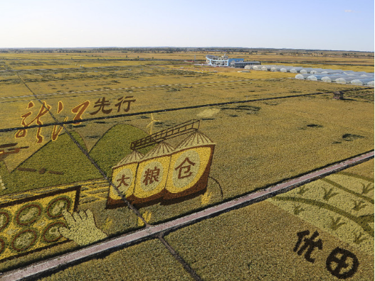 黑龙江省富锦市万亩水稻科技示范园的巨型3D稻田画。记者 石枫 摄