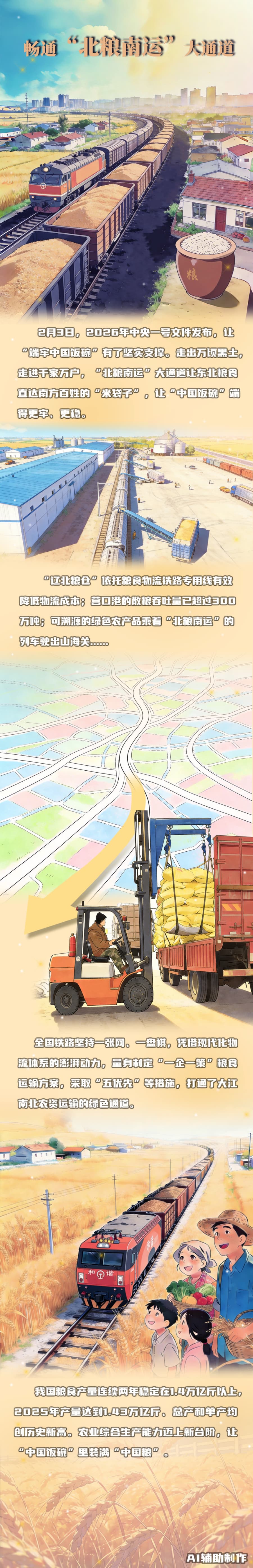 近几年,人民生活水平逐渐提高,“菜篮子”“米袋子”供应充足,餐桌上的“花样”愈发繁多。南方的餐桌摆上东北的大米,早已不是新鲜事。在这背后,“北粮南运”大通道起到了关键作用。这条连接白山黑水与江南水乡的粮食通道,一边系着农民的“钱袋子”,一边连着百姓的“米袋子”——它让北方粮食丰富南方餐桌,也为东北粮食外销畅通渠道,实现好收成与好收入的“双向奔赴”,让“中国饭碗”端得更稳、更实。