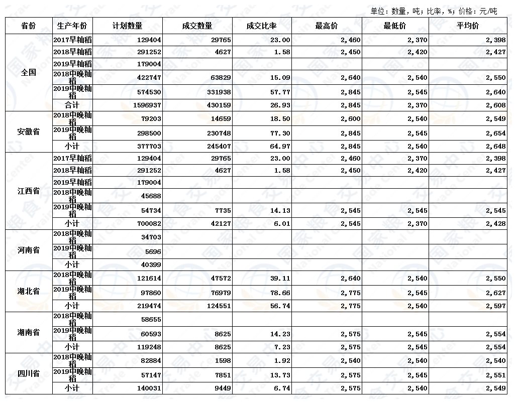 12月11日最低收购价稻谷(2017-2019年)交易结果
