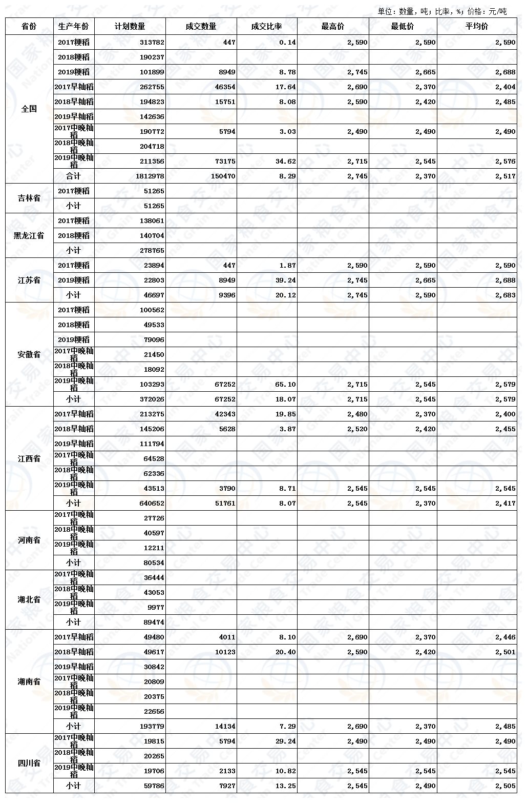 9月11日最低收购价稻谷(2017-2019年)交易结果