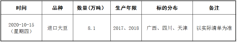 受中储粮油脂有限公司委托,2020年10月15日9:30在国家粮食和物资储备局粮食交易协调中心及联网的各省(区、市)国家粮食交易中心组织开展进口大豆竞价交易,请交易会员通过国家粮食交易中心官网(www.grainmarket.com.cn)登录“国家粮食交易平台→我要买粮→参加竞价交易→中央储备粮轮换交易”参与交易。现就有关事项公告如下(重点提示内容详见加粗字体部分):