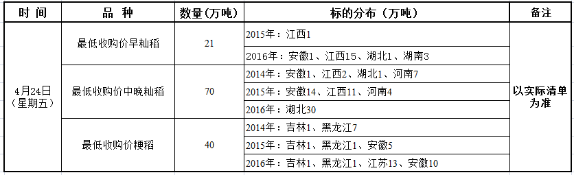 经国家有关部门研究决定,2020年4月24日在国家粮食和物资储备局粮食交易协调中心及联网的各省(区、市)国家粮食交易中心组织开展最低收购价稻谷竞价交易,请交易会员通过国家粮食交易中心官网(www.grainmarket.com.cn)登录“国家粮食电子交易平台→我要买粮→参加竞价交易→最低收购价稻谷竞价销售”参与交易。现就有关事项公告如下(重点提示内容详见加粗字体部分):