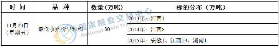 经国家有关部门研究决定,2019年11月29日在国家粮食和物资储备局粮食交易协调中心及联网的各省(区、市)国家粮食交易中心组织开展最低收购价稻谷竞价交易,请交易会员通过国家粮食交易中心官网(www.grainmarket.com.cn)登录“国家粮食电子交易平台→我要买粮→参加竞价交易→最低收购价稻谷竞价销售”参与交易。现就有关事项公告如下(重点提示内容详见加粗字体部分):