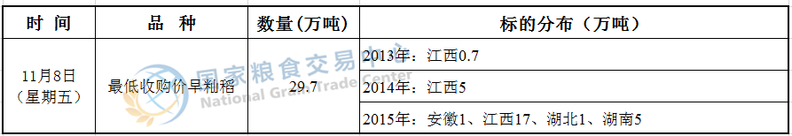 经国家有关部门研究决定,2019年11月8日在国家粮食和物资储备局粮食交易协调中心及联网的各省(区、市)国家粮食交易中心组织开展最低收购价稻谷竞价交易,请交易会员通过国家粮食交易中心官网(www.grainmarket.com.cn)登录“国家粮食电子交易平台→我要买粮→参加竞价交易→最低收购价稻谷竞价销售”参与交易。现就有关事项公告如下(重点提示内容详见加粗字体部分):