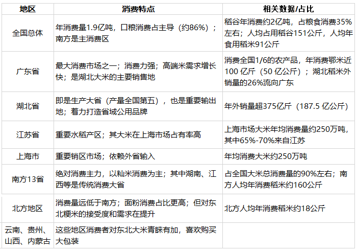 南方地区 (13省) 绝对消费主力;以籼米消费为主;其中湖南、江西等是传统消费大省 占全国大米消费总量的90%左右;南方人均年消费稻米约160公斤 。