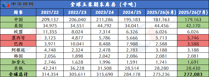 美国农业部7月玉米供需报告数据偏多,但市场呈现偏空效应。美国方面(2025/26年度),因面积下调,产量预估下调1.15亿蒲式耳至157.05亿蒲式耳(高单产水平不变),但仍是创记录水平;期初库存减少2500万蒲式耳至13.40亿蒲式耳。主因2024/25年度出口强劲(上调1亿蒲式耳至创纪录的27.5亿蒲式耳)部分抵消了饲料及剩余用量下滑(下调7500万蒲式耳);受饲料及剩余用量下降影响,总使用量预估减少 5000 万蒲式耳至127.35亿蒲式耳;因供应降幅(期初库存+产量)大于使用量降幅,期末库存预估下调 9000 万蒲式耳至16.6亿蒲式耳;新作农场均价预估维持4.20美元/蒲式耳不变。全球方面(2025/26年度),全球总产预估下调232万吨至12.6366亿吨,加拿大和墨西哥增产部分抵消了美国减产;全球贸易量变化不大;期末库存预估下调316万吨至2.7208亿吨,主因中国、印度库存减少,部分被巴西库存增加所抵消。