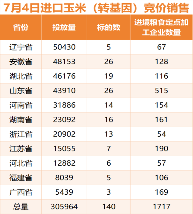 7月4日中储粮在全国范围内进行了进口玉米的年内的第二次拍卖,与7月1日首轮拍卖不同的是,此次拍卖不再采取定向邀标的方式,取而代之采取了公开竞价的方式。其中要求“买方应当基于交易清单及实际看样的情况,自行判断进口玉米是否符合自身的采购及使用需求(包括但不限于进口玉米是否属于转基因、参考指标等),该批进口玉米严禁流入口粮市场”。投放量级方面也有所放大——投放总量为305964吨。投放标的覆盖11个省份共计140个标的(下图所示)。
