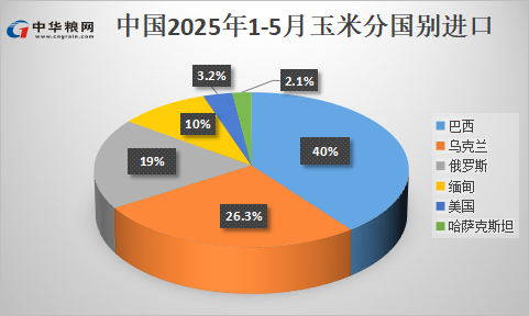 1-5月玉米进口量共计63万吨,同比减少约94%。其中,从巴西进口玉米25万吨,占比40%;乌克兰进口16.5万吨,占比26.3%;俄罗斯进口12万吨,占比19%;缅甸进口6.1万吨,占比10%。