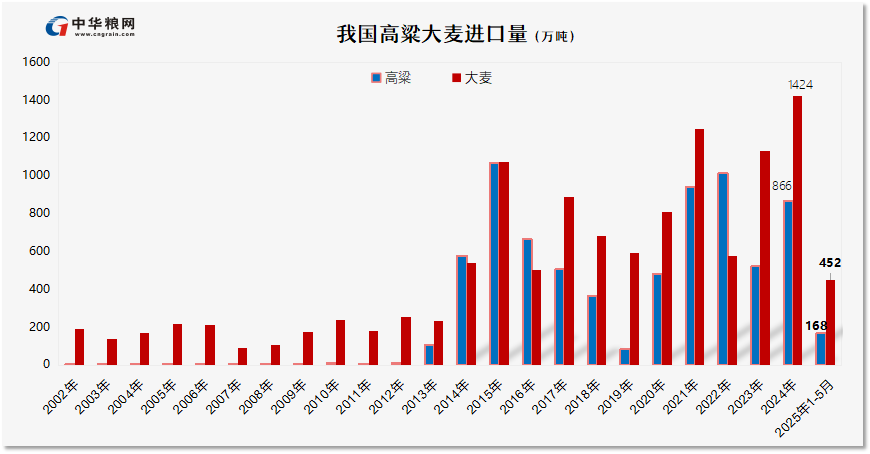 高粱:5月进口高粱38万吨,同比减少43.5%;1-5月累计进口高粱168万吨,同比减少53.9%。