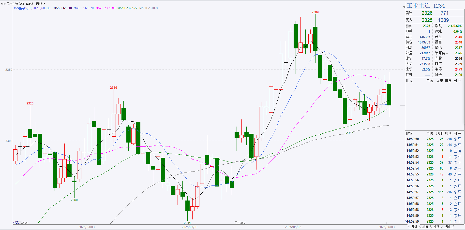 6月3日是六月首个交易日,也是端午后首日,玉米各合约全面下跌,开门黑。主力合约高开低走,冲高减弱后小幅回落,开盘2340元,最高2348元,几分钟后走低,最低跌至2317元,下午有所反弹,最终收盘于2325元。
