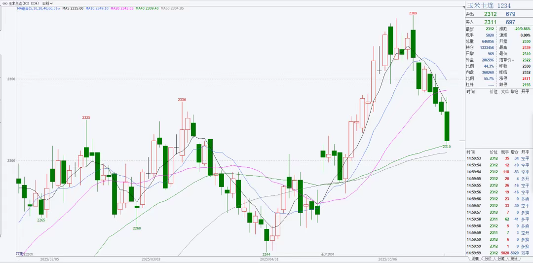本周玉米期货延续回调趋势,继续下探。周二玉米2507合约最低跌至2310元,比5月12日的最高点2389元回落了79元,当日收盘于2312元,短短几个交易日下跌七八十元,且连续第四日下跌,无疑表明近期处于回调趋势中。