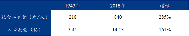 首先看一下建国以来我国粮食生产发展情况。1949年我国粮食产量为2263.6亿斤,经过不断发展,2018年粮食总产量13157.8亿斤,增幅为481%。1949年我国粮食平均亩产为137.2斤,2018年为749.4斤,增幅为446%。1949年我国人均粮食占有量为418斤,2018年增加到840斤,人均占有量高于世界平均水平。