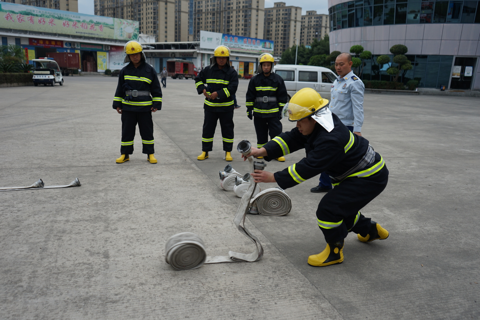 三、消防安全演练。现场一部登高车、一部多功能水罐车,10名消防官兵与我市场领导、职工、义务消防队员参加演练。此次演练的主要内容包括如何正确使用消防器材和操作技术规范、密集型场所人员如何疏散、自救、逃生。