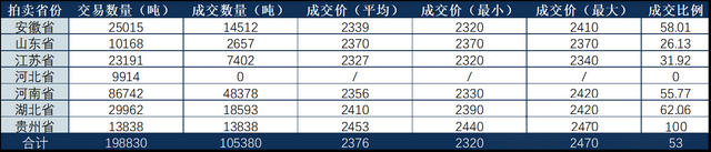 贵州因本身地处销区,且投放量较少,实现100%成交,成交价在2320-2410元/吨,溢价150元/吨以上;湖北成交率超60%,基本以底价成交。江苏成交率不足33%;山东成交率仅26%;河北全量流拍。