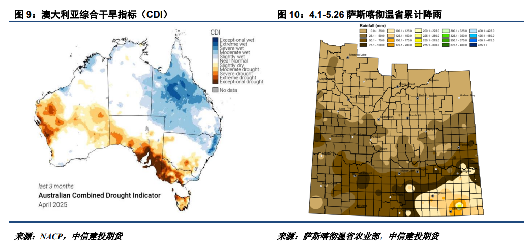 不过,无论25/26年度加菜籽最终产量如何,更大的悬念在于中加关系、美加关系及美国生物柴油政策的外生冲击。加菜籽压榨悬念将导致全球菜油供应前景不甚明朗。另外6-8月期间全球菜籽陆续进入天气敏感阶段,目前澳大利亚以及加拿大部分区域的干旱或成为后期市场焦点。总的来说,25/26年度菜籽产量增幅及压榨前景不及葵籽。