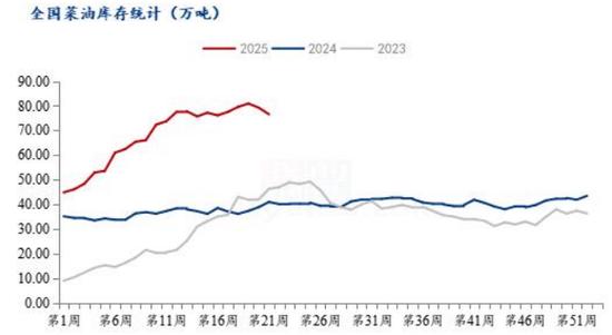 相对豆棕而言,菜油走势平稳的多。机构统计截止5月23日,全国主要地区菜油库存总计76.59万吨,较上周下跌2.66万吨,处于近年高位水平。