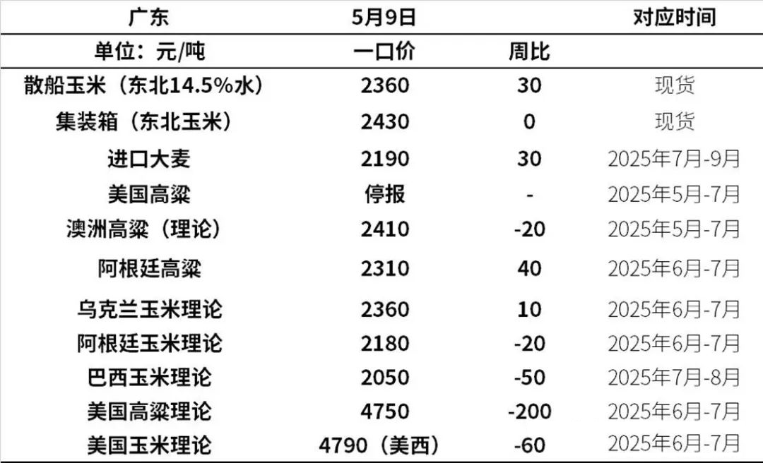 现货市场方面,截至2025年5月9日(第18周)全国玉米均价2352元/吨,周比上涨52元/吨。