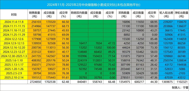 其次,不考虑地方政策性储备小麦采购,我们通过上方中央储备粮竞价交易情况的统计图表,也可以看到中央储备粮小麦的单向采购数量已经连续三周大于单向销售数量,且采购小麦的年份是2024年产,那么这就极大地减轻了政策性储备小麦轮出销售对市场的压力。结合图表我们可以看到,从2024年11月至2024年2月中旬,尽管我们看上去中央储备粮小麦轮出销售的数量非常庞大,但其实3个多月净轮出销售数量也只有110万吨左右(购销双向交易轮出和轮入是对等的),通过轮入采购小麦的方式来对冲小麦轮出销售给予市场的压力,也能够对当前小麦市场供大于需的结构起到修复作用,虽然这存在着寅吃卯粮的问题,但在当前的小麦市场环境下,也是政策面的又一招妙手。