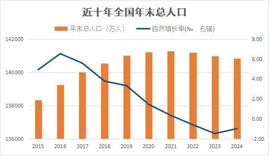 2024年末全国人口为140828万人,比上年末减少139万人,连续三年出现人口负增长,自然增长率为-0.99‰。尽管出生人口有所反弹,达到954万人,但仍低于2022年的水平,未来一段时间人口负增长趋势难以改变。