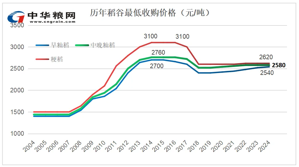 2024年稻谷最低收购价格是在3月1日公布,即:2024年生产的早籼稻(三等,下同)、中晚籼稻和粳稻最低收购价分别为每50公斤127元、129元和131元。对比来看,早籼稻比2023年上涨1分,连续5年上调,中晚籼稻和粳稻保持平稳。