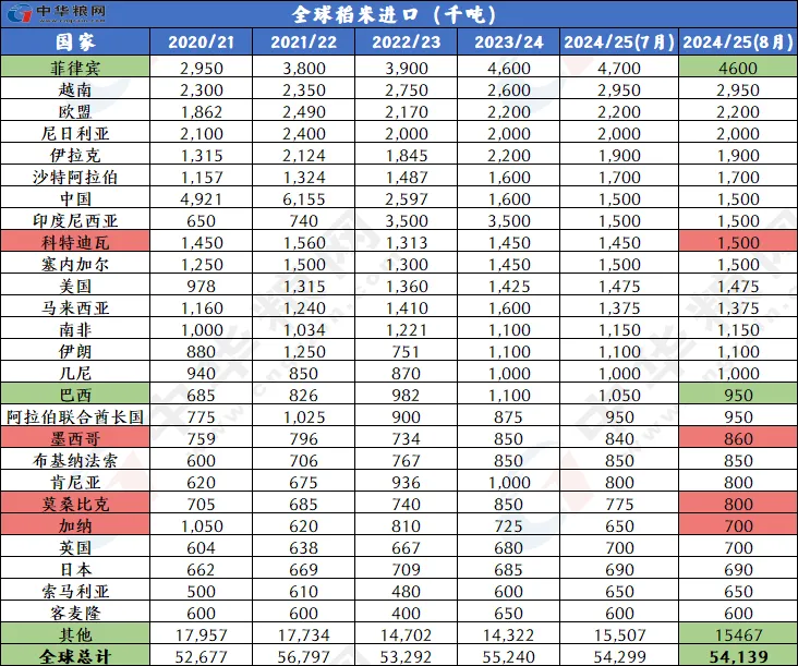 美国农业部8月供需报告偏利多。2024/25年度全球大米供应、消费、贸易和期末库存数据较上月全线下调。其中全球大米供应量减少100万吨至7.044亿吨,主要因为越南和菲律宾的初期库存减少以及越南的产量减少。全球大米消费量小幅下降至5.27亿吨,因为菲律宾、越南和肯尼亚消费减少量大于巴西的消费增加量。全球大米贸易量降至5440万吨,因为巴西和越南的出口减少。预计全球大米期末库存将减少70万吨至1.774亿吨,主要因为越南的库存减少。8月份全球大米供需形势由宽松转向趋紧,或将减缓国际大米价格下跌幅度。