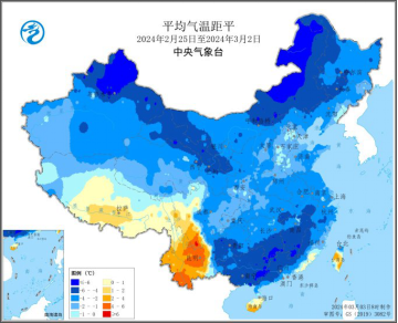 本周(2024年2月25日-3月2日),全国大部地区气温较常年偏低1~4℃,新疆北部、甘肃中部和北部、内蒙古西部和中东部、东北地区西部和中部、江南南部、华南西部和北部、贵州西南部等地偏低4~6℃,部分地区偏低6℃以上;仅西南地区南部等地气温偏高1~4℃(图1)。江淮东部、江南大部、华南西部和北部降水量有10~50毫米,上述大部地区接近常年同期或偏多3成至4倍,全国其余地区降水不足10毫米或无降水(图2)。新疆南疆西部、西北地区东部、江南大部、华南大部、以及四川盆地、贵州西部等地日照时数较常年同期偏少3~9成,新疆北部、东北地区南部、华北东部、黄淮东部、江淮中北部、江汉西部和中东部、贵州东部、云南东部和南部等地较常年偏多3~9成,全国其余大部地区日照接近常年(图3)。