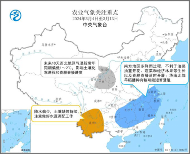 南方大部气温偏低、日照偏少,其中江南南部、华南西部和北部阴雨日数普遍有5~6天,低温阴雨寡照天气不利油菜、露地蔬菜等在地作物生长以及早稻播种育秧和秧苗生长,部分低洼田块湿渍害加重,适温高湿的田间环境利于病虫害发生发展,蔬菜、瓜果的产量和品质也受到一定影响。西南地区大部光温充足、墒情适宜,有利冬小麦、油菜等作物生长和春播生产,但四川南部、云南南部周内仍无有效降水,墒情持续偏差,不利夏粮产量形成和春玉米、一季稻等播种。
