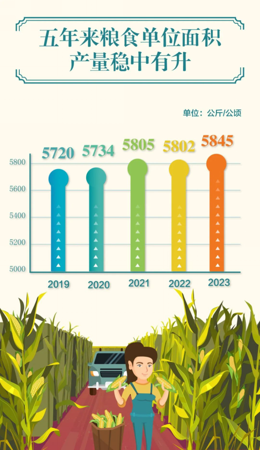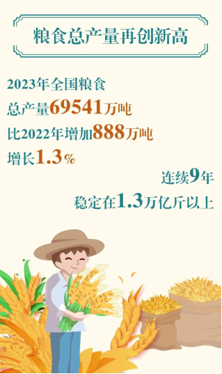 小账连大账。国家统计局11日公布的数据显示,2023年全国粮食总产量达到13908.2亿斤,创历史新高,增产177.6亿斤,粮食产量连续9年站稳1.3万亿斤台阶。尤其是全国300个粮食大县发挥了主力军作用,单产提升贡献率达73%。