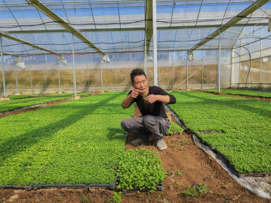 陈兆武在展示通过大棚培育的油菜苗。新华社记者张华迎 摄