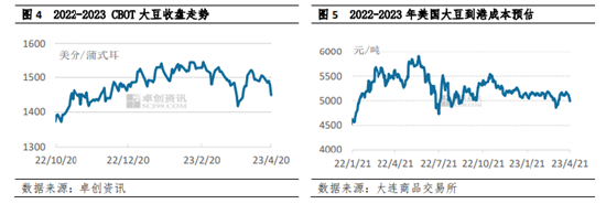 近日,CBOT大豆市场价格亦整体下挫。虽然阿根廷的减产力度仍有增加的可能,但巴西大豆产量创历史新高的预期正在演变成现实,丰产的压力使得市场承压明显,CBOT大豆期货收盘价格弱势下滑,4月中旬跌至1450美元/蒲式耳以下。美豆价格的走弱使得国内大豆到港成本预估价格降低,截至4月21日,预估成本价格跌破5000元/吨关口。