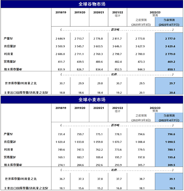 粮农组织2023年季末世界谷物库存量预报数上调580万吨,至8.5亿吨,但仍较期初水平下降0.3%。根据最新的预报数,2022/23年度世界谷物库存量与消费量之比为29.7%,尽管略低于2021/22年度的30.7%,但总体水平仍然适宜。全球粗粮库存量本月调增220万吨,但预计仍将较期初水平减少4.3%。由于阿根廷和美国的出口前景调低以及乌克兰的估计产量调高,主要玉米出口国的库存量预计将有所增加,是本月调增的主要原因。全球小麦库存量预报数本月亦获上调,390万吨的上调幅度进一步推动较期初水平的预期增幅增至5.3%。与粗粮情况类似,本月小麦库存量上调也集中在主要出口国,包括澳大利亚(估计产量增加)、欧盟(官方差额修正)和俄罗斯(出口预期下降)。2022/23销售年度季末的世界大米库存量预报数为1.941亿吨,较2021/22年度创下的最高纪录低240万吨。这一水平足以满足4.4个月的预期全球消费量,这主要是由于亚洲储备的前景仍接近创纪录水平,即归功于印度的预期库存恢复。其他地区的库存结转前景则更为黯淡。拉丁美洲及加勒比地区以及非洲的情况尤其突出,部分原因是南美和东非减产,但也源于加纳、埃塞俄比亚和塞内加尔等国的进口前景有所下降。