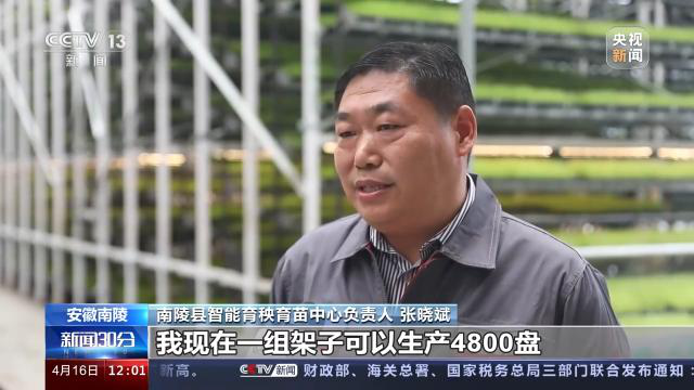 南陵县智能育秧育苗中心负责人 张晓斌:我现在一组架子可以生产4800盘,相当于10亩的大田育秧,能够满足650亩的水稻种植。我整条生产线是无人化的自动运行的生产车间,整个育秧时间将近节约一半时间。