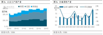 中长期来看,除了宏观压制作用仍然存在,油脂供需格局也将注定本轮行情仅仅是触“底”反弹。从大豆和油菜籽的产量数据来看,均存在较为明显的丰产预期。据美国农业部数据显示,美国、巴西和阿根廷2022/2023年度大豆的产量分别为114.75、139.50和46.2百万吨,其中美国、巴西较去年同期分别增加18.08、11百万吨,阿根廷则因天气干旱,大豆产量较去年同期减少2.60百万吨。同时全球油菜籽产量也将达到80.23百万吨,环比增长近11.28%。虽然需求端同样有所增加,但需求增量远不及供给增量,大豆和油菜籽价格中长期重心仍存下移基础,豆油和菜籽油价格或也顺势有所回落。