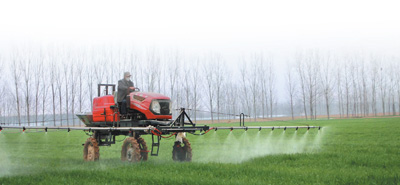 在山东五莲县汪湖镇莫家崖头村一处麦田,农民在操作喷杆喷雾机喷洒除草剂。 |