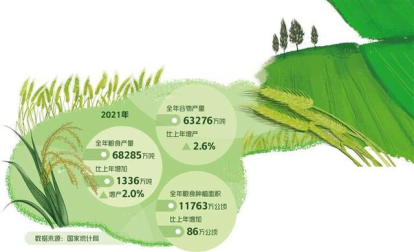 2021年,我国粮食总产量达到6.83亿吨,连续7年超过6.5亿吨,口粮储备长期保持在70%以上;保持耕地面积19.18亿亩,粮食播种面积达17.64亿亩,建成高标准农田9亿亩左右。目前,农业科技进步贡献率超过61%,农作物耕种收综合机械化率超过72%,小麦、水稻、玉米三大主粮基本实现良种全覆盖和全程机械化,农田有效灌溉面积超过10亿亩,农业综合生产能力明显提升,农业现代化水平显著提高,夯实了保障国家粮食安全的基础。