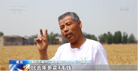 湖北省襄阳市襄州区黄集镇薛刘村村民 张新国:一斤小麦都卖到1.5元,比去年多卖4毛钱,一亩地增收都在400(元)到500(元)之间,今年国家补贴又下发得早,耕地地力补贴一亩地70多元,种粮一次性补贴一亩地有14元左右,都是国家扶持的,确实高兴。