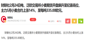 财联社2月24日电,泛欧交易所小麦期货开盘飙升至纪录高位,主力5月小麦合约上涨14%,至每吨335.00欧元。泛欧交易所3月玉米期货上涨11%,至合约新高每吨296.25欧元。