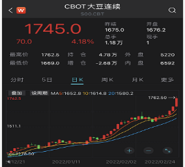 大豆也不遑多让,上涨4.64%,报收1752美分/蒲式耳,延续强劲态势。