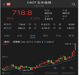 玉米期货也涨停,升幅超5%,至716.25美分/蒲式耳,为去年6月10日以来的最高水平。