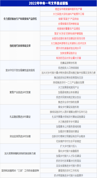 与往年相比,2022年中央一号文件在粮食安全领域的部署占有更重分量,且居于各项举措之首。相较于2021年中央一号文件,两年乡村振兴总体目标不变,2022年则在前期的基础上提出了更加细化的措施。