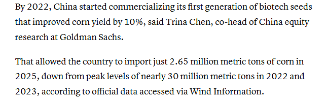 报道还称,中国在农业研究与开发方面投入巨大,2019年至2021年其公共部门在这方面的支出大约是美国的两倍。报道援引高盛中国股票研究部联席主管的观点称,到2022年,中国已开始将第一代生物育种产业化应用,这些种子使玉米产量提高了10%。报道还援引万得资讯获得的官方数据称,这使得中国在2025年的玉米进口量仅为265万吨,远低于2022年和2023年近3000万吨的峰值水平。