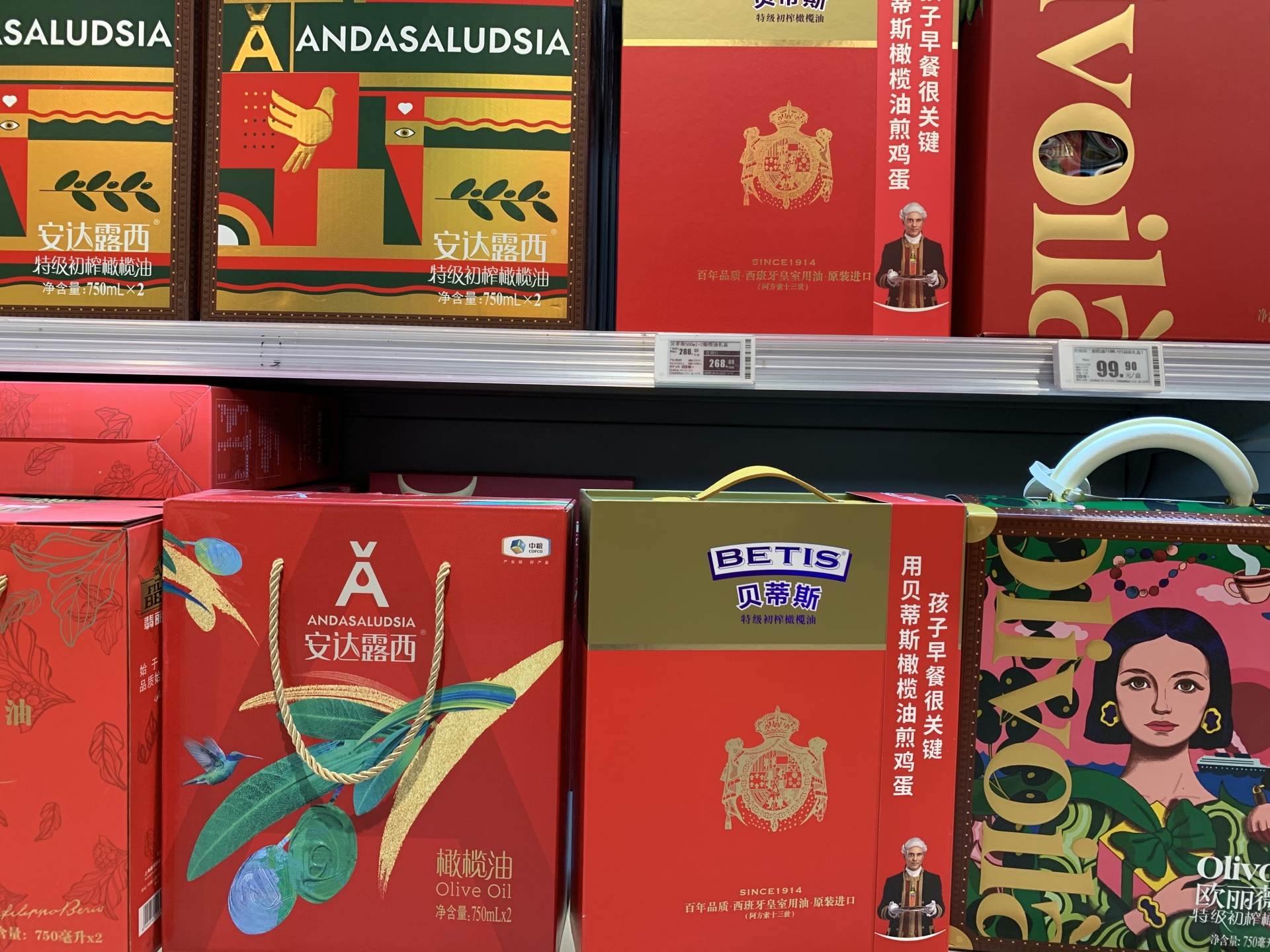 商超货架摆放的橄榄油礼盒。