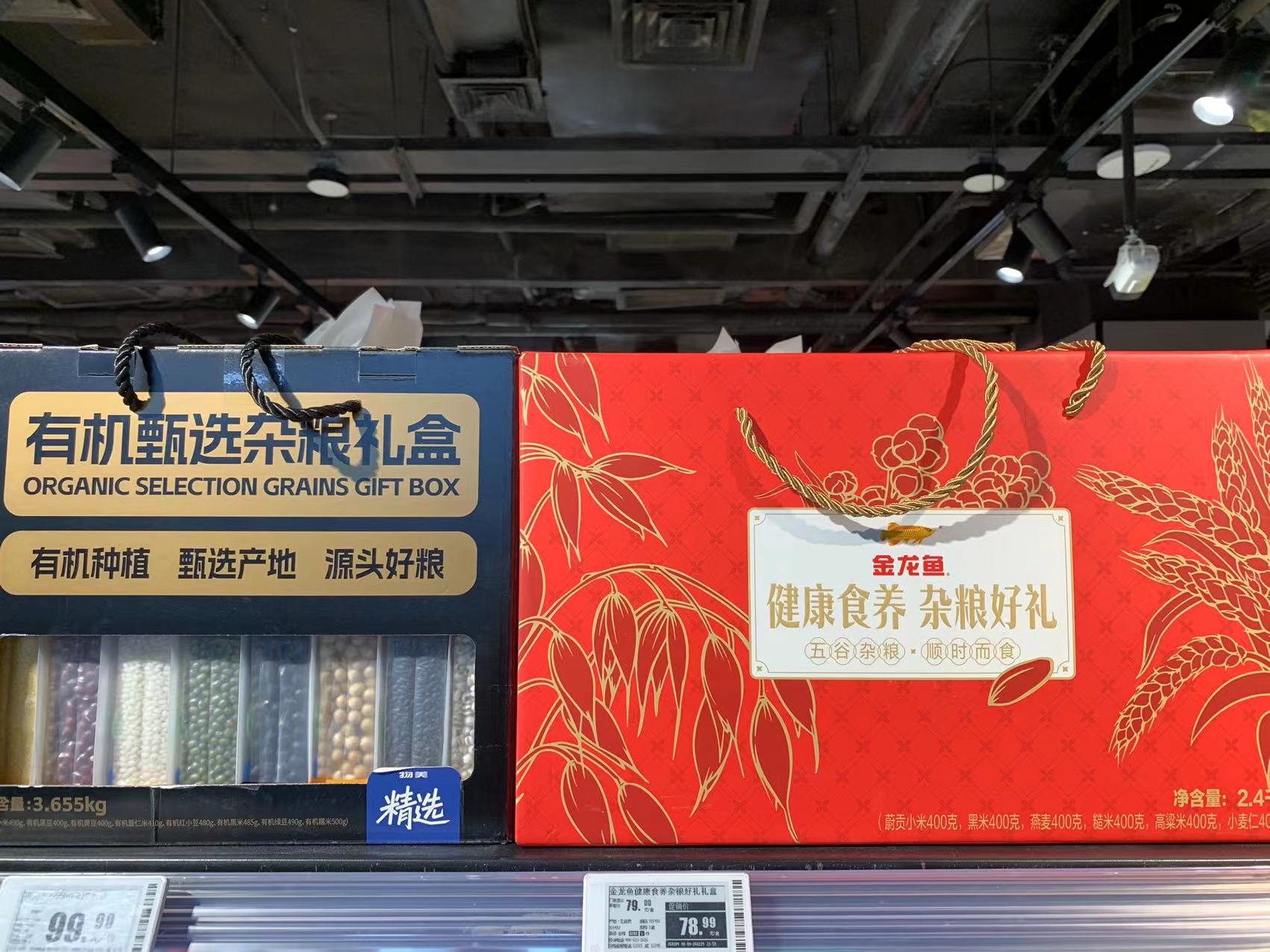 杂粮礼盒也受到青睐。永辉超市推出定制的五谷丰登有机杂粮礼盒,在门店年货礼盒区域摆放售卖。在物美(陶然亭店),一位售货员称,金龙鱼“健康食养,杂粮好礼”五谷杂粮礼盒、有机甄选杂粮礼盒销量较好。