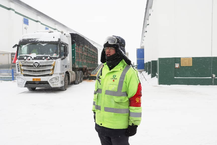 中储粮汤原直属库仓储保管员在雪中坚守岗位。