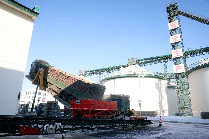 在中储粮哈尔滨直属库,通过液压翻板机进行卸粮作业。