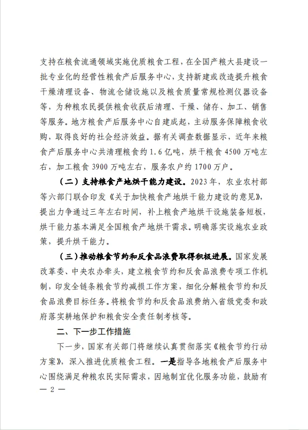 下一步,国家有关部门将继续认真贯彻落实《粮食节约行动方案》,深入推进优质粮食工程。一是指导各地粮食产后服务中心围绕满足种粮农民实际需求,因地制宜优化服务功能,鼓励有条件的地方建设覆盖全产业链的粮食产后社会化服务中心,提供一站式解决方案,让更多农民享受产业增值收益,保障国家粮食安全。二是深入贯彻落实党中央、国务院决策部署,充分发挥粮食节约和反食品浪费专项工作机制作用,加强统筹协调,综合施策、形成合力,以钉钉子精神狠抓落实,推动粮食节约和反食品浪费取得更大成效。