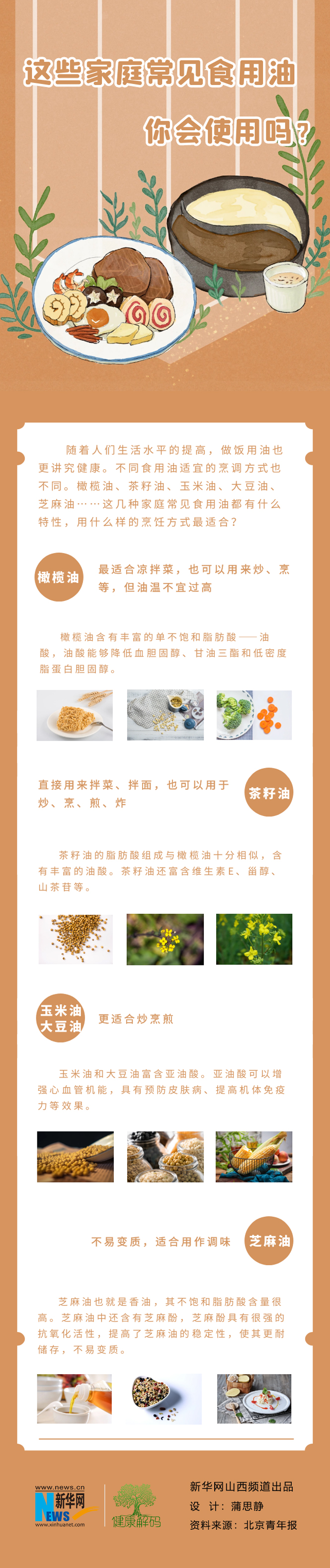 随着人们生活水平的提高,做饭用油也更讲究健康。不同食用油适宜的烹调方式也不同。橄榄油、茶籽油、玉米油、大豆油、芝麻油……这几种家庭常见食用油都有什么特性,用什么样的烹饪方式最适合?