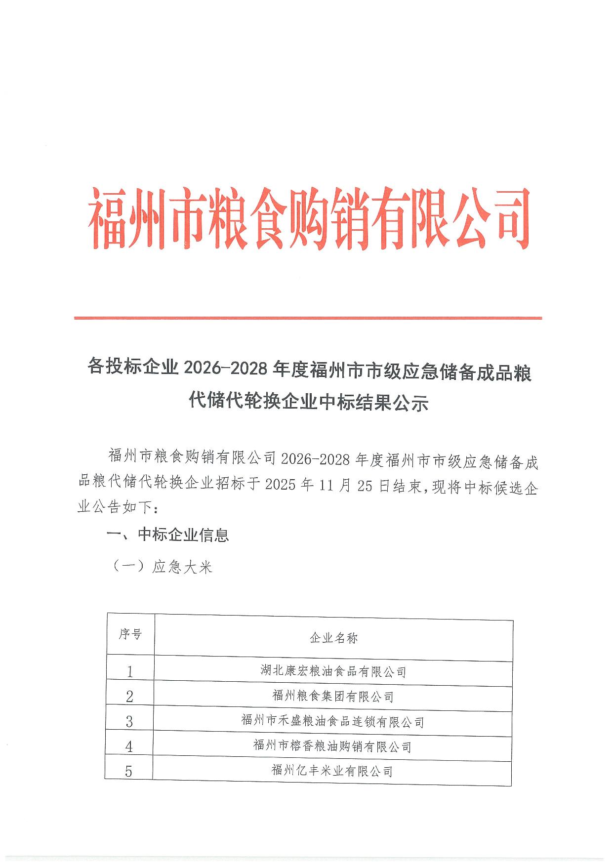 各投标企业2026-2028年度福州市市级应急储备成品粮代储代轮换企业中标结果公示