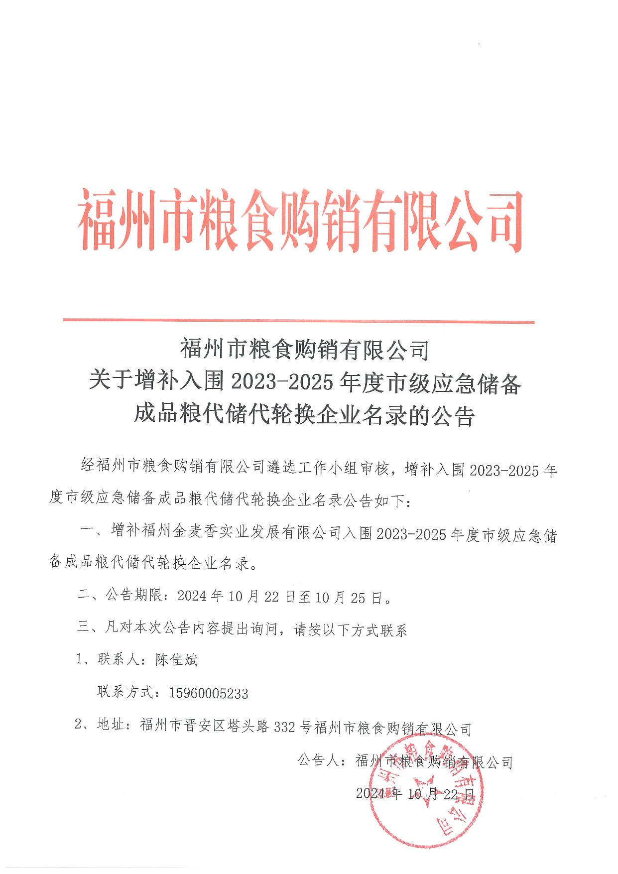 福州市粮食购销有限公司关于增补2023-2025年度市级应急储备成品粮代储代轮换企业名录的公告