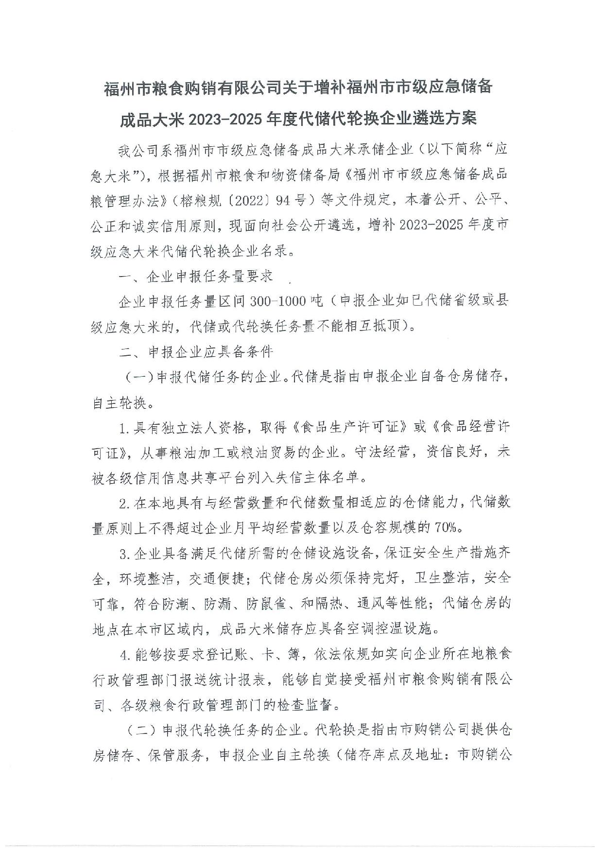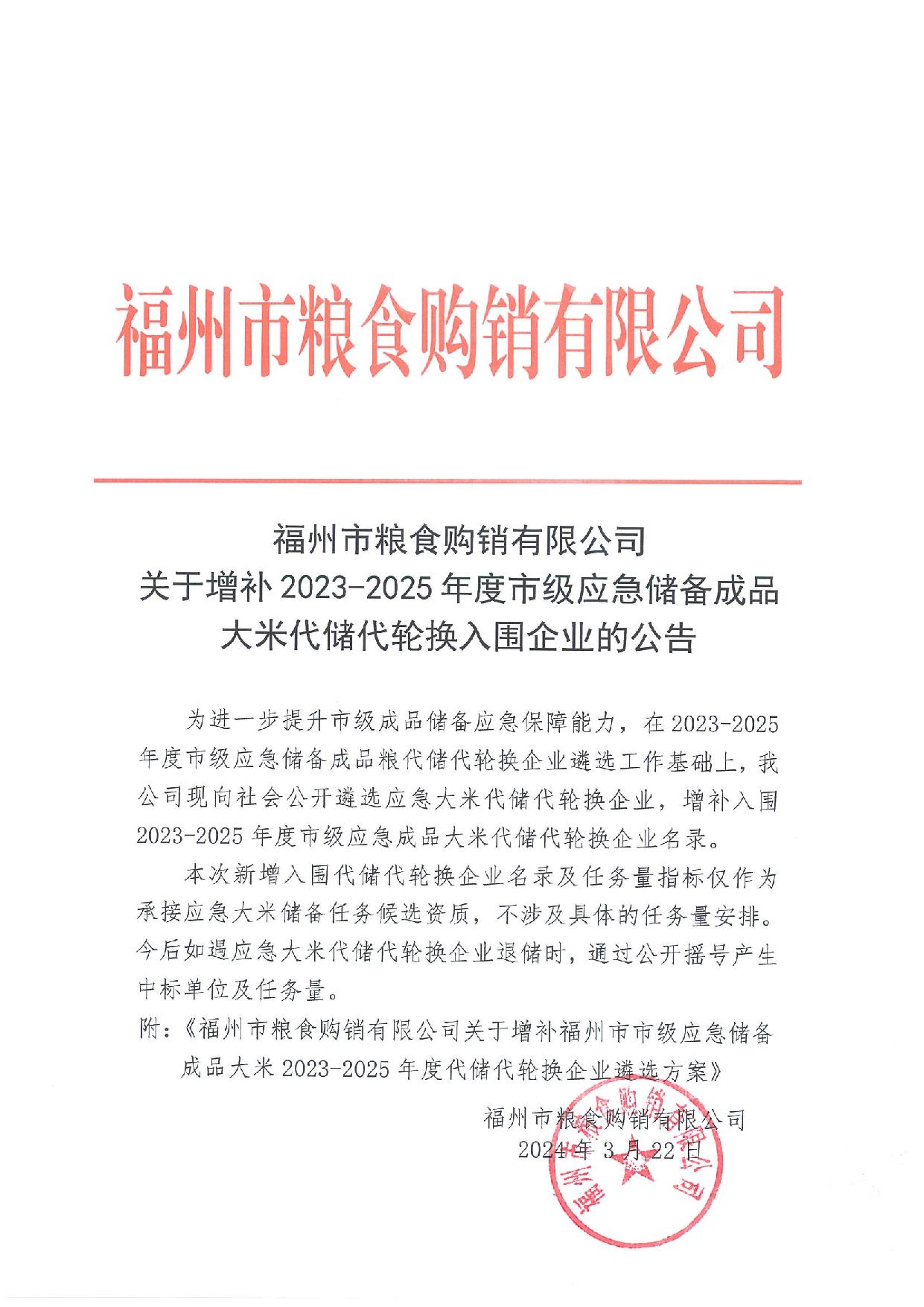福州市粮食购销有限公司关于增补2023-2025年度市级应急储备成品大米代储代轮换入围企业的公告